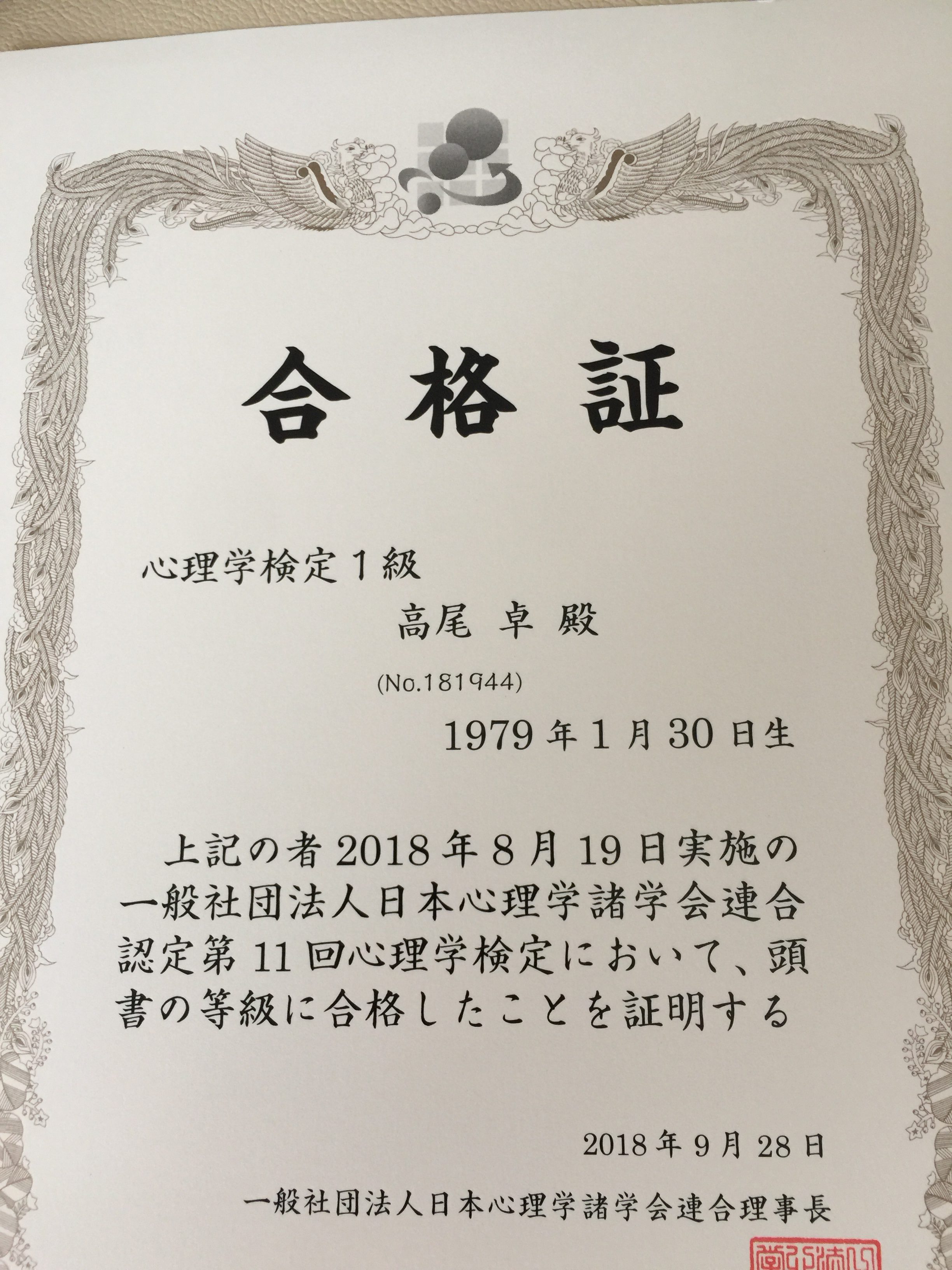 その内の1つ、心理学検定の結果が来ました!